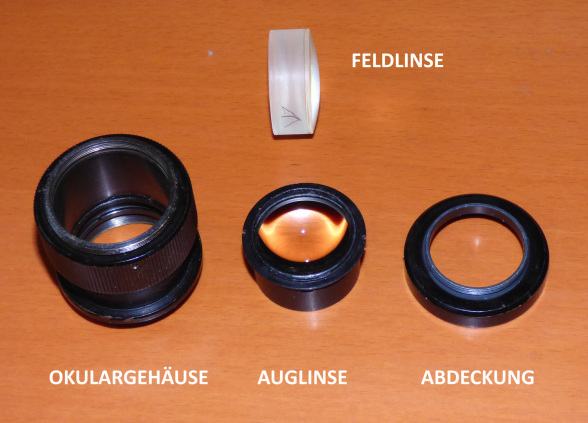 Das Astropan-Okular ist einfach zu demontieren. Nach abschrauben einer Abdeckkappe kann die Auglinse direkt aus dem Okulargehäuse herausgedreht werden. Die Feldlinse fällt anschließend bei umgedrehten Fernglas heraus.