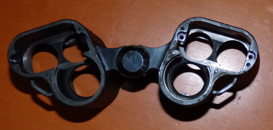 Gehäuse mit präzise gefrästen Prismenauflager, jedoch ohne seitliche Fixierung. Ab Mod. 49 hat Huet wie Anfang des Jahrhunderts Prismen wieder im Fernglas justiert und dann über Zinnverguss in Blech-Haltestreifen und Prismenkopf fixiert.