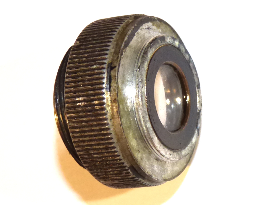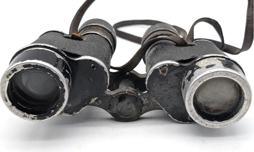 Das Fernglas war mit günstigem Preis auf der französischen Ebay-Seite eingestellt und ich war der einzige Bieter. Sehr wahrscheinlich handelt es sich nach der Aufschrift um ein französisches Militärfernglas: 'MG', 8x30 'Grand Champ'. Leider wurde das Herstellerlogo und Seriennummer, rechts ausgeschliffen. Von der Bauweise her handelt es sich offenbar um kein Huet, BBT Krauss oder SRPI Glas, Hersteller die fast ausschließlich das französische Militär in den 30er und 40er Jahre beliefert haben.